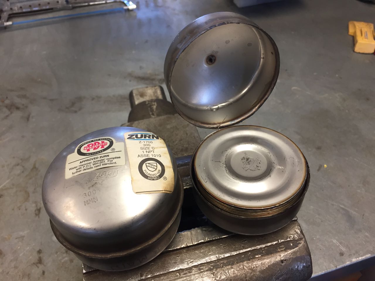 These are Zurn water hammers. They gave their all for the cause and we cut one open to see what is inside. Turns out it has a bellows in it. Fancy