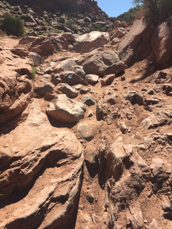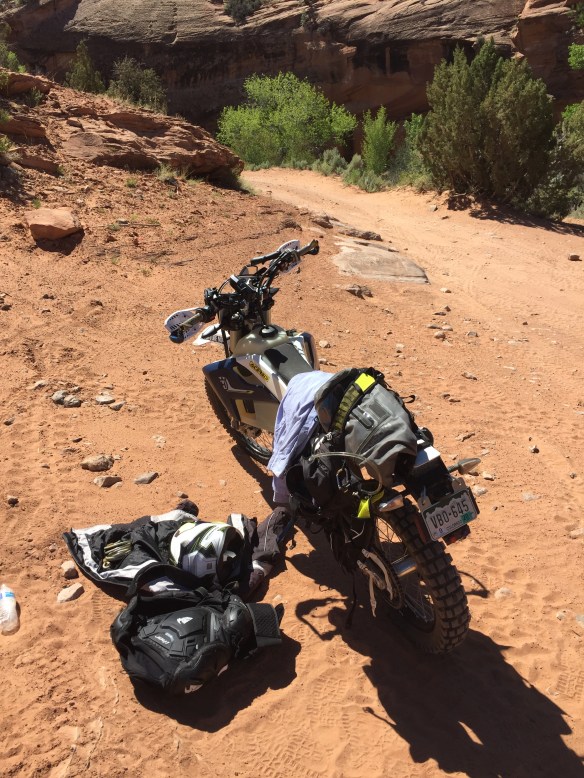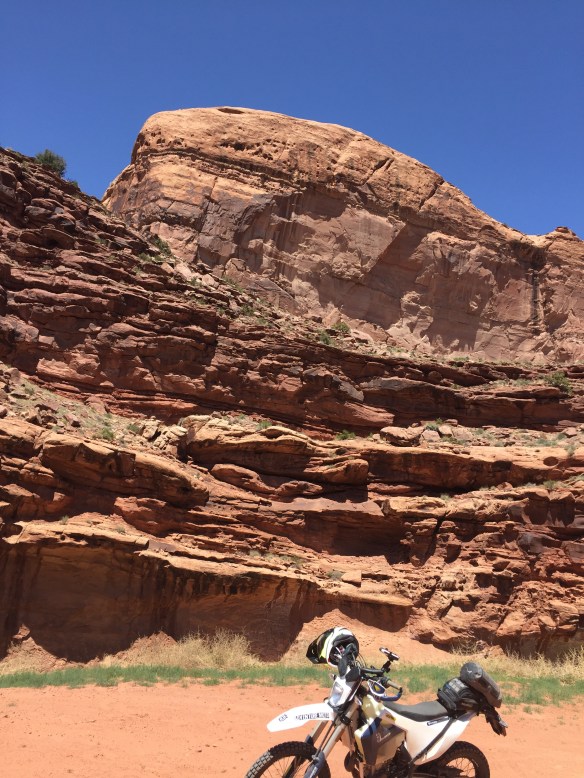I did watch about 8 UTV’s, 2 big-tire jeeps, and a couple of 300cc 2-strokes bash their way up this. Not for my old bones. Average speed on this trip was 8 mph. It took me over 7 hours to ride out and back to/from Moab. There are a lot of kewl trails in this area. If you are in Moab, ride ’em!