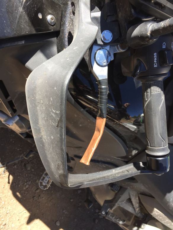 We stopped for gas at the corner station in Del Norte and John was attacked by a gravity storm and went down. Broke the clutch lever on his VFRX 1200. We called a few places looking for a replacement with no luck. Then John had the bright idea to stop at Kens’ Tire and Automotive where Darren had the solution. We hammered a section of copper pipe on the broken lever stub and Darren bent it into a curve. Brilliant! I’m guessing it will last about a hundred years like that